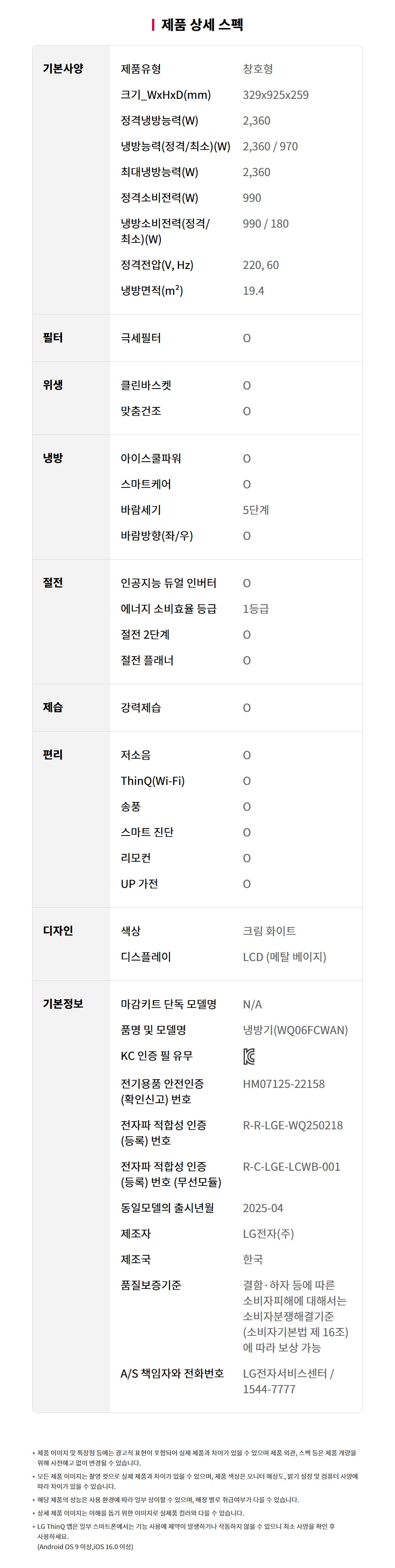선택 : ★신세계상품권5만원★[임직원전용] LG 휘센 오브제컬렉션 엣지 창호형 에어컨 마감키트 미포함 WQ06FCWUS